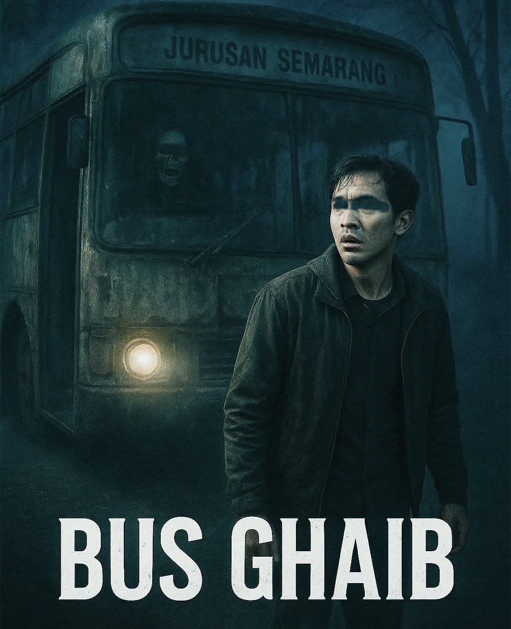 Dari arah depan, sopir bis menoleh. Wajahnya bukan manusia, melainkan tengkorak kering dengan mata kosong menyala merah.