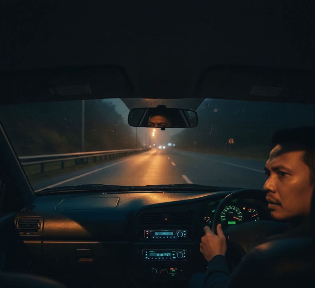 Malam itu hujan rintik sejak sore. Bukan hujan deras, tapi jenis hujan yang membuat udara lengket dan napas terasa berat. Jam di dashboard menunjukkan pukul 23.07. Jalan tol nyaris kosong. Lampu-lampu jalan menyala pucat, sebagian berkabut tipis seperti diselimuti asap dingin.
